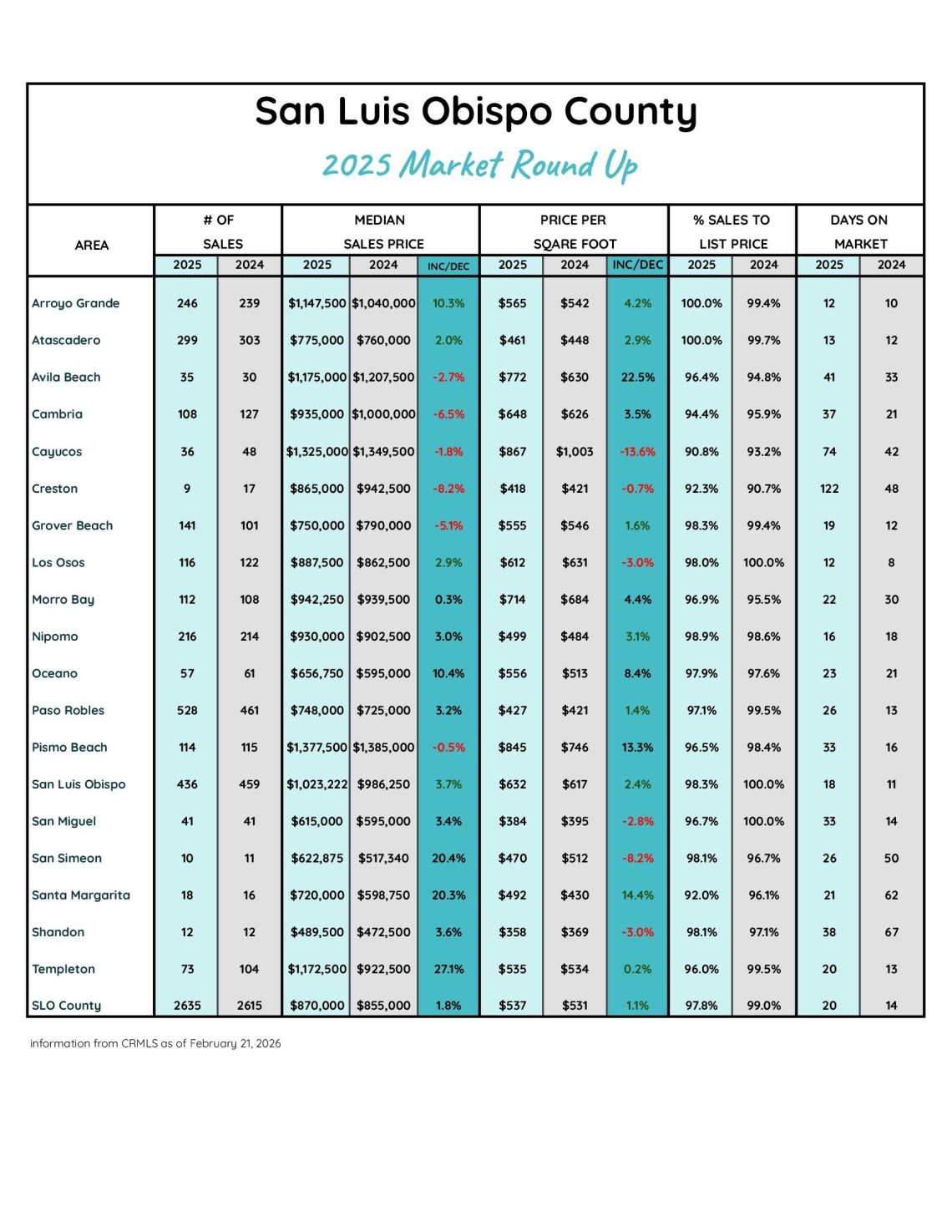 Whether you’re watching Paso Robles homes for sale, tracking Arroyo Grande property values, or evaluating coastal SLO County real estate, the story this year is balance — with pockets of exceptional performance.