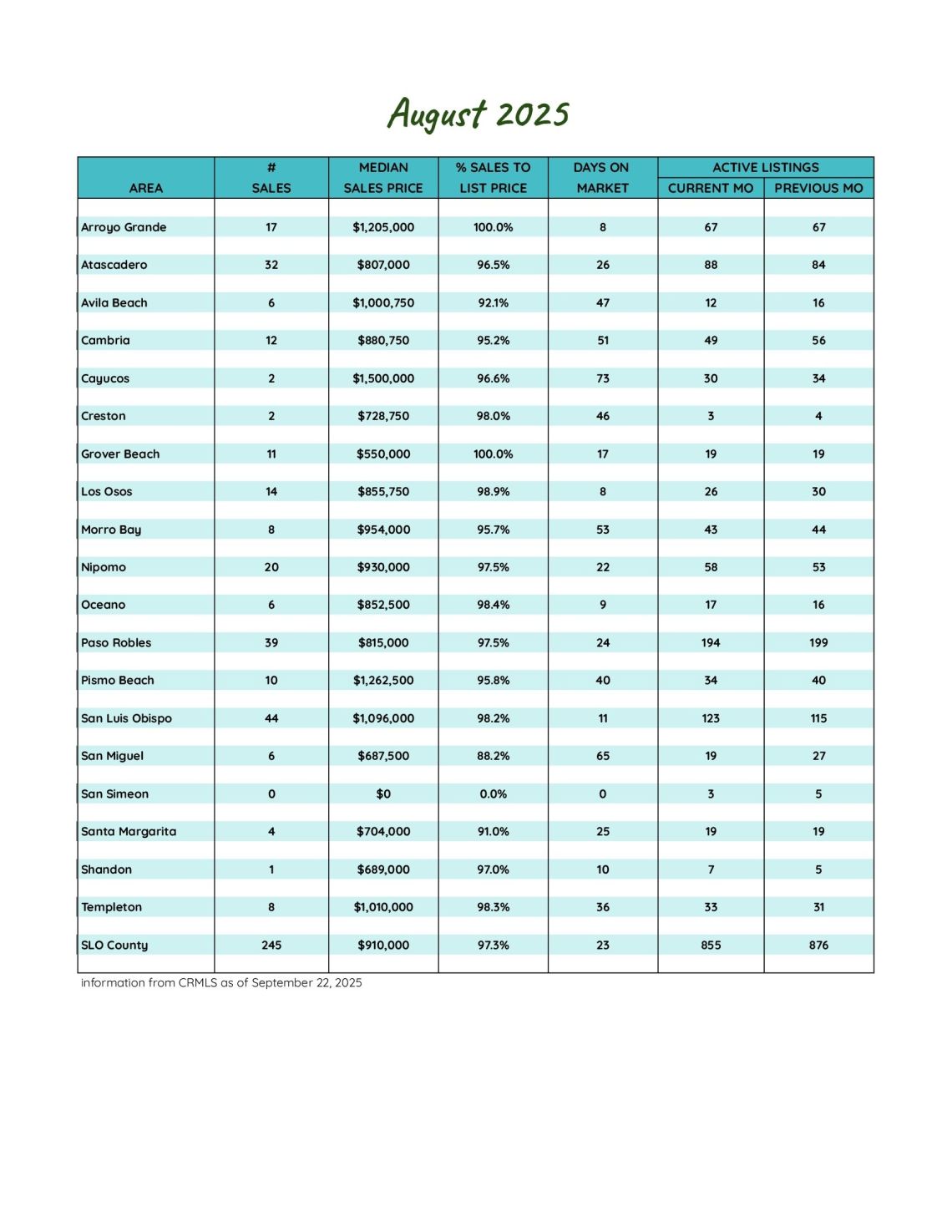 As summer winds down, the San Luis Obispo County housing market is settling into a slower rhythm. August’s numbers reveal fewer new listings, a dip in buyer momentum, and slight pricing gains—evidence that buyers and sellers are adjusting to a more balanced playing field. While inventory remains elevated compared to last year, fewer homes are hitting the market, and sales activity continues to moderate.