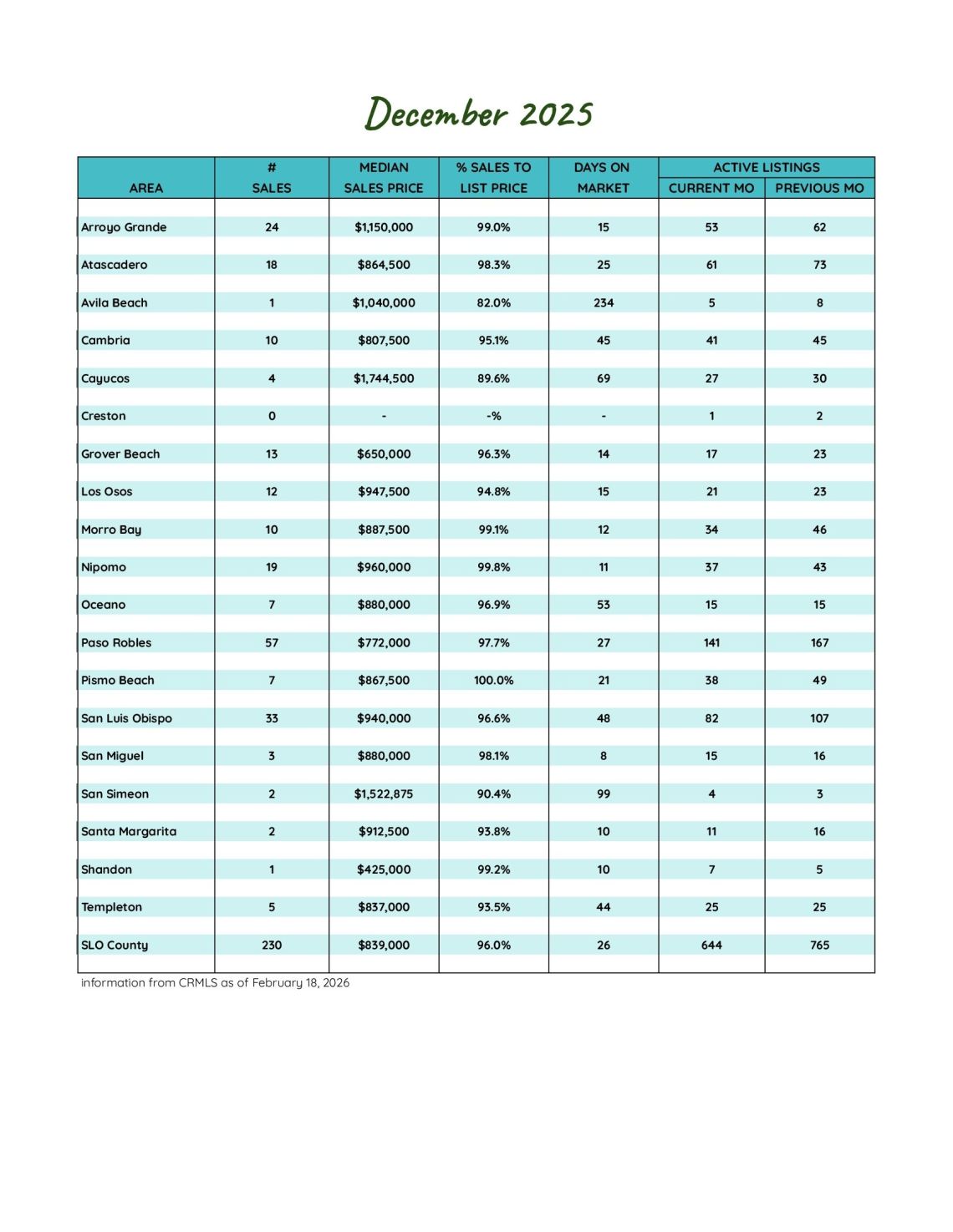 As 2025 comes to a close, the San Luis Obispo County housing market reflects a seasonal slowdown paired with notable strength in closed sales. December’s data shows fewer new listings, tightening inventory, and a surge in year-end closings, while pricing metrics indicate slight softening as buyers gain negotiating leverage.